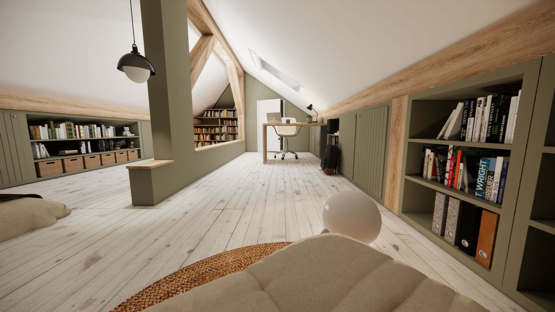 Le grenier présentait plusieurs contraintes : un muret central incontournable limitant fortement l’aménagement, une seule fenêtre de toit pour éclairer l’ensemble de la pièce et des pentes prononcées réduisant la circulation. Nous avons repensé l’espace pour le rendre lumineux, fonctionnel et accueillant. Un sol en bois blanc accentue l’esprit cabane tout en maximisant la clarté, un bureau a été placé sous le Velux pour bénéficier de la lumière naturelle, des rangements intégrés occupent les bas de pentes et un coin lecture cocoon invite aux longues soirées de lecture.