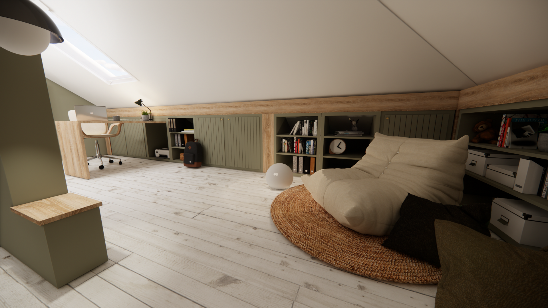 Le grenier présentait plusieurs contraintes : un muret central incontournable limitant fortement l’aménagement, une seule fenêtre de toit pour éclairer l’ensemble de la pièce et des pentes prononcées réduisant la circulation. Nous avons repensé l’espace pour le rendre lumineux, fonctionnel et accueillant. Un sol en bois blanc accentue l’esprit cabane tout en maximisant la clarté, un bureau a été placé sous le Velux pour bénéficier de la lumière naturelle, des rangements intégrés occupent les bas de pentes et un coin lecture cocoon invite aux longues soirées de lecture.