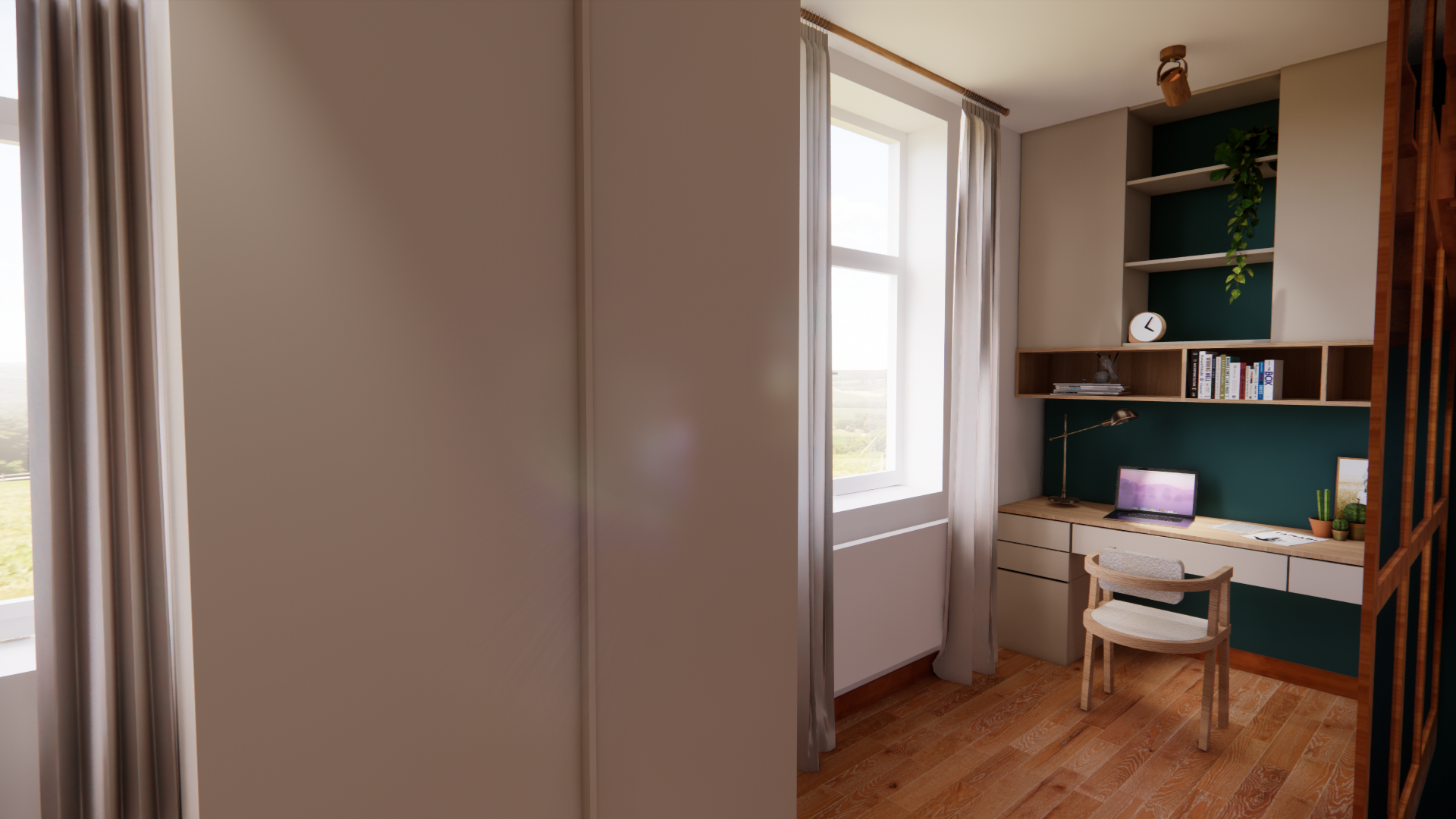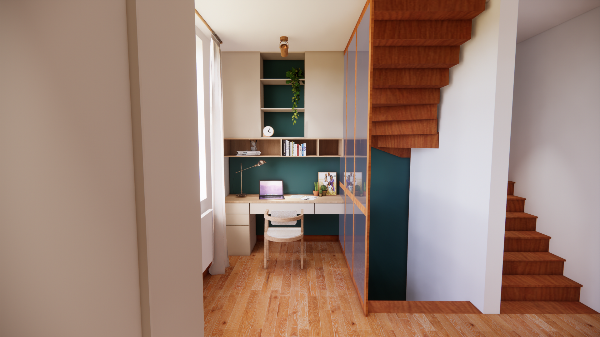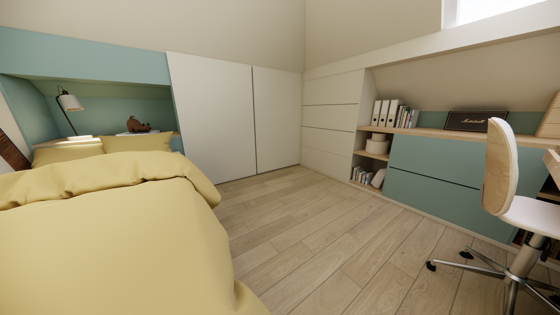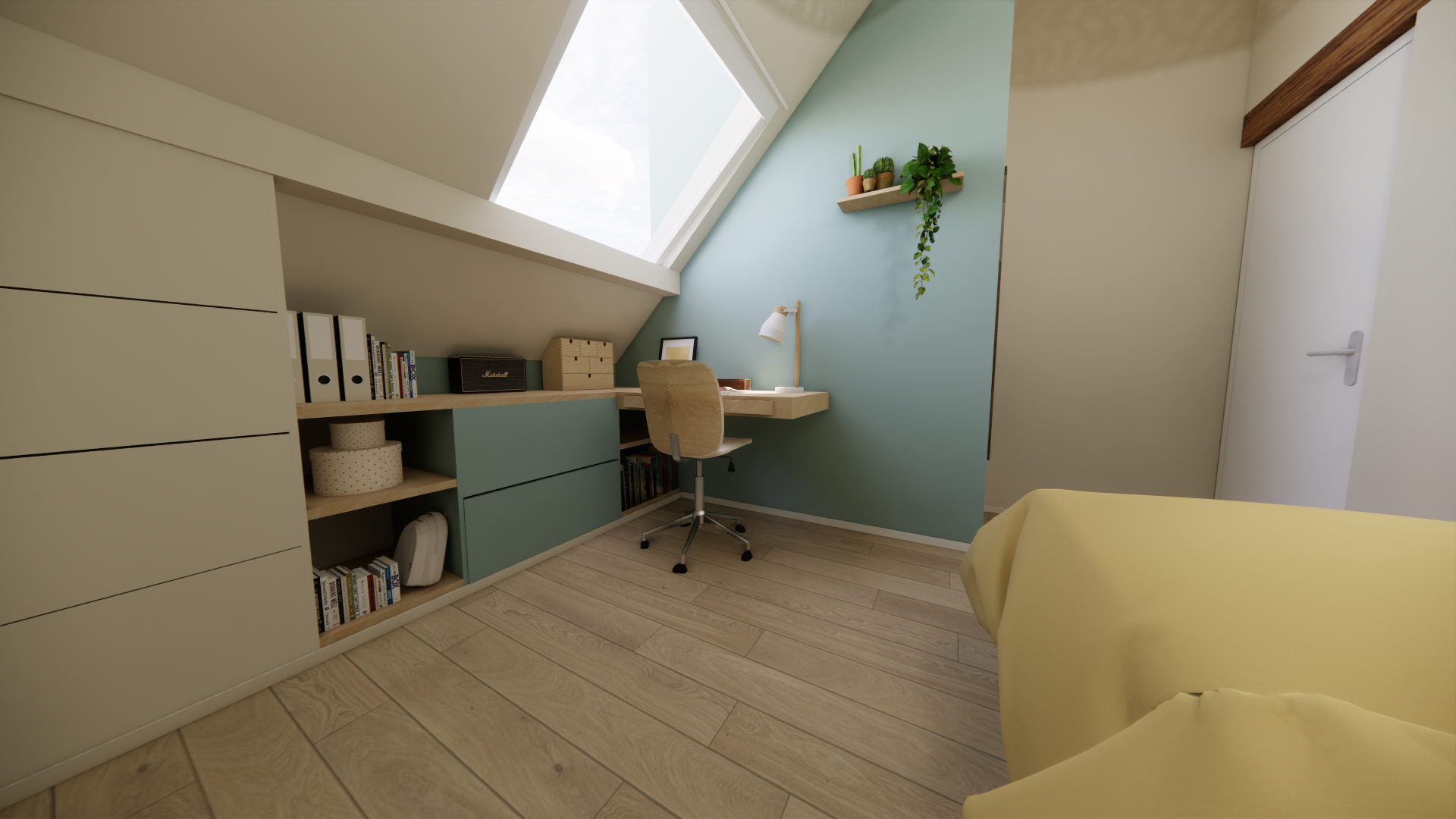La priorité a été donnée à la lumière naturelle. Les Velux ont été intégrés aux chambres et les bureaux placés juste en dessous afin d’offrir un cadre lumineux et propice à la concentration. Les bas de pente et les zones sous poutres ont été optimisés avec des rangements sur-mesure, permettant de préserver fonctionnalité et fluidité.