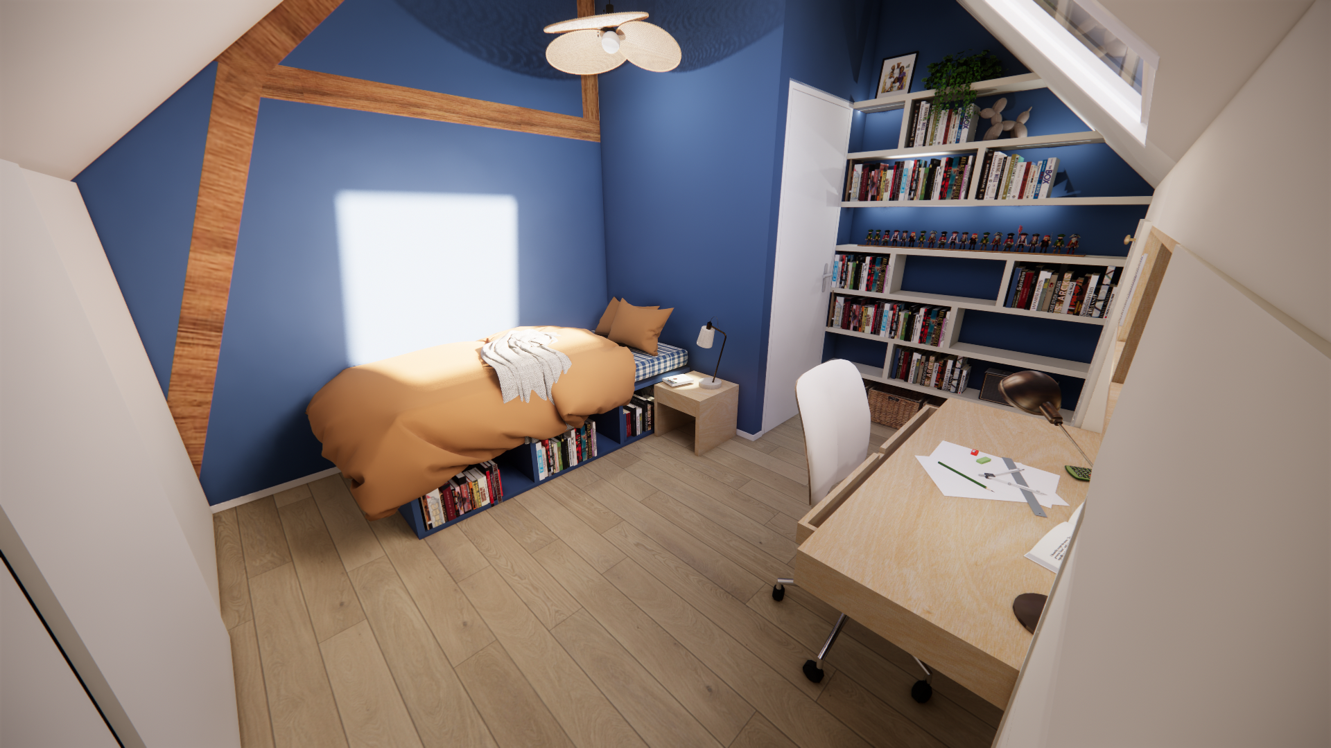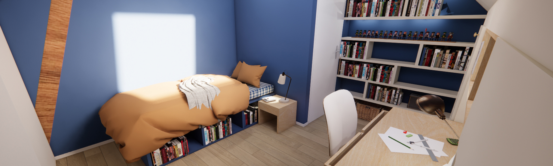 Dans la chambre de Victor, un bleu nuit profond crée une atmosphère calme et introspective. Passionné de lecture, il bénéficie désormais d’un véritable cocon, pensé pour se recentrer et s’évader.